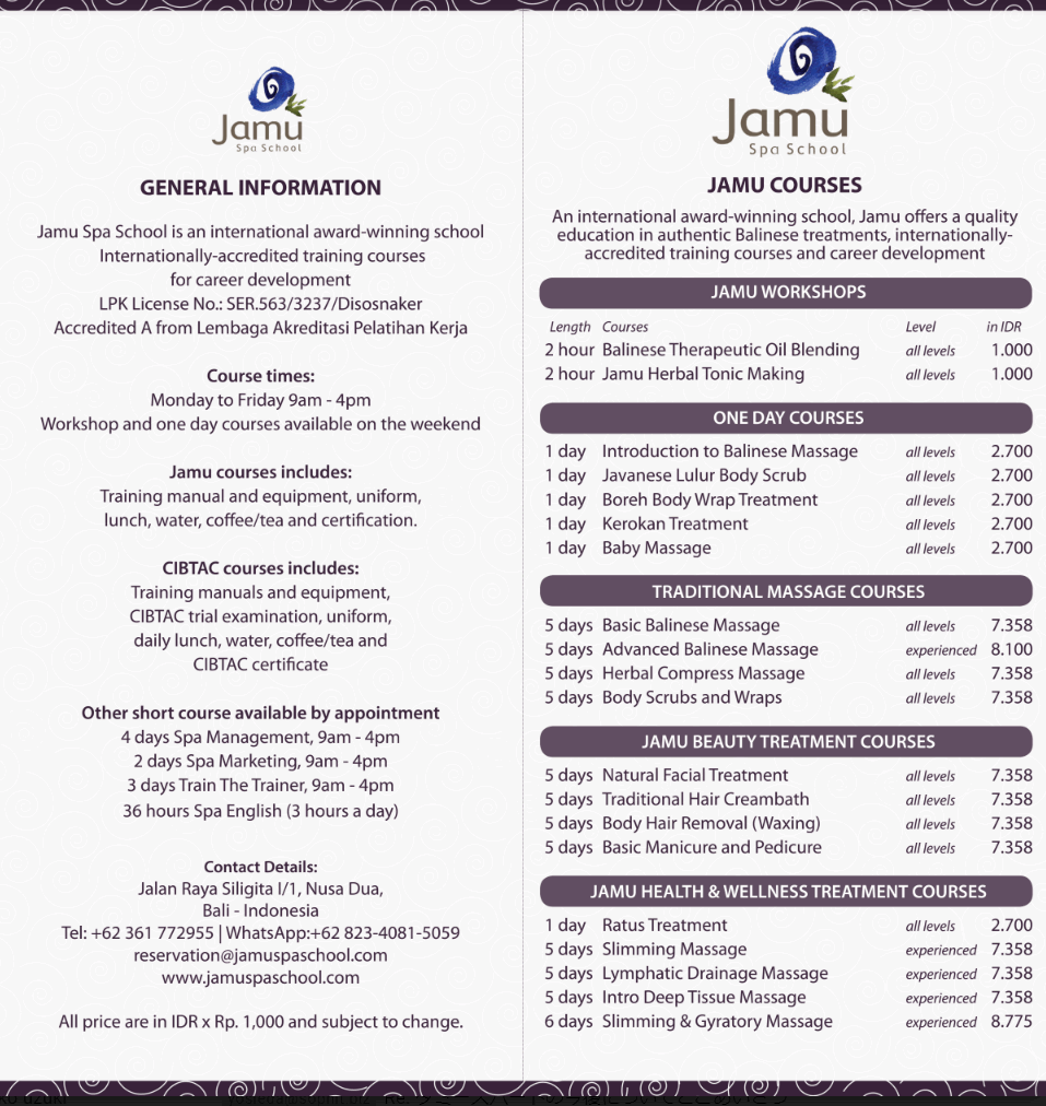 ジャムースパスクールは 創業1898年、30年以上の実績のあるバリ島の数あるスパスクールの中でも随一の実績のあるインドネシア(バリ州)政府認定校。